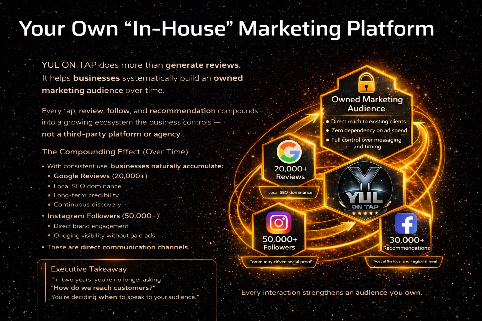 In today’s market, online reputation isn’t optional it’s the deciding factor. YUL ON TAP helps businesses capture authentic customer feedback at the exact moment satisfaction is highest. All the while behind the scenes we’re helping you grow your own business into a self sufficient marketing engine.. All driven from within.